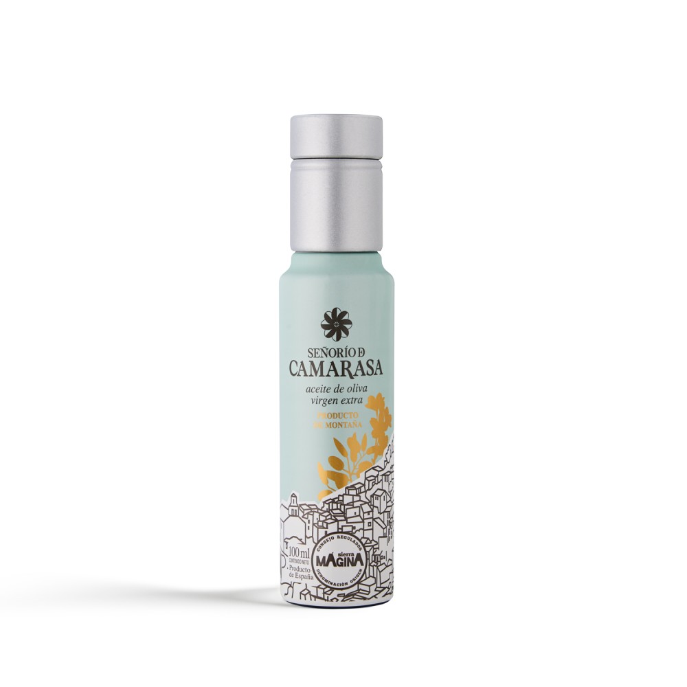Botella de AOVE Cosecha Temprana Señorío de Camarasa en formato 100 ml, perfecta para viajar o como detalle elegante en celebraciones y eventos. Contiene un exclusivo aceite de oliva virgen extra de olivares de montaña en Sierra Mágina, elaborado con aceitunas verdes tempranas que aportan un sabor intenso, fresco y equilibrado.